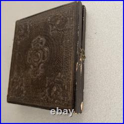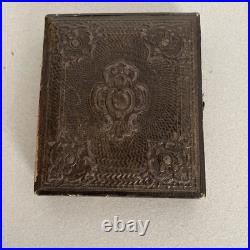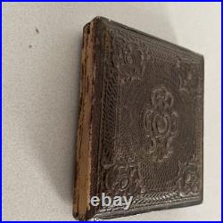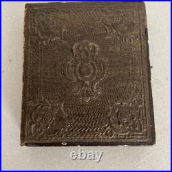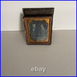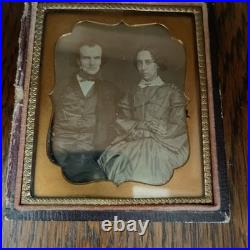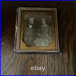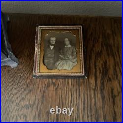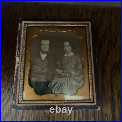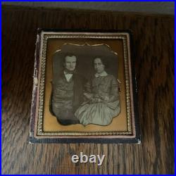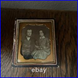 This product is a rare and unique 1/4 plate daguerreotype featuring a husband and wife with full skirts, captured in the 1850s. The image is hand-tinted and matted in a framed gold jewelry case, showcasing a timeless portrait of Americana fashion and lifestyle. This collectible piece is a one-of-a-kind original production from the United States, highlighting the artistry and history of figurative photography from that era.