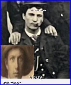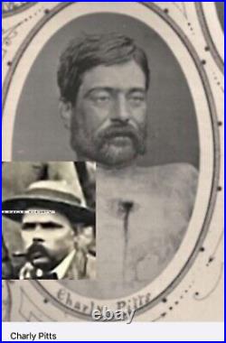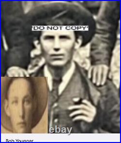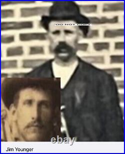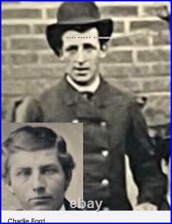 AUTHENTIC: Bad Ass Jesse James Gang, Frank James, Bob & Charlie Ford, Bob Younger, Cole Younger, Jim Younger, John Younger & Charly PItts Group Tintype Photo. An Extremely Rare James gang photo that includes SUPER RARE " Charly Pitts". Very few photos of Charly Pitts known to exist. It took me awhile to figure out who the ninth member was, because I was not familiar with ever seeing him in any photo other then in his death photo were he's shot in the chest. But, that is definitely Charly Pitts with that Square Chiseled face in this gang photo.