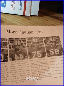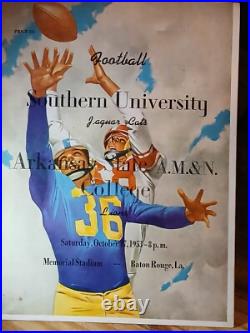 This rare collectible captures a piece of history with the 1953 Southern University Jaguars versus Arkansas A & M College football game. A must-have for any collector interested in Black Americana, this item showcases the rich cultural heritage of HBCU (Historically Black Colleges and Universities) and their impact on American culture. The game was a significant event, bringing together two of the nation's leading black educational institutions, and is sure to be a cherished addition to any collection. Don't miss your chance to own a piece of black history.