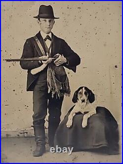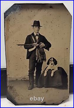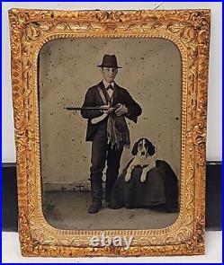 Original Tintype Photographic Studio Image Man with Double Barrel Shotgun & Dog. 1/4th plate with Gold Gilt Frame. Well-Dressed Man in Clothing of the Period. Coat, Hat, Vest and Hunting/Equestrian Boots. Game Bird Bag and Powder Horn over Shoulder.
