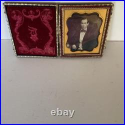 The product is a unique quarter plate daguerreotype featuring a gentleman with hand-colored cheeks, a vest, and a large bow tie. This antique photograph from the 1850s is matted and framed, showcasing black and white image color with a matte finish.