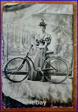 Tintype Photo Pretty Victorian Woman With Bicycle Antique 1800s